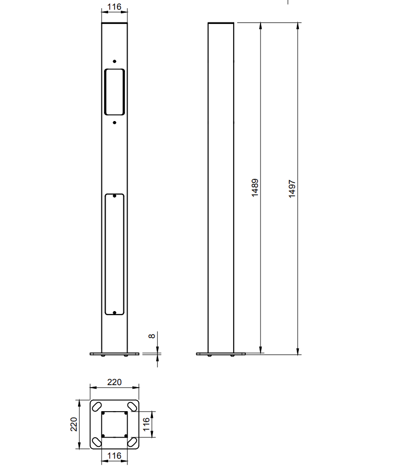 The base of the ONEPOLE. Height 1500 mm. Innumerable combinations and customization make the ONEPOLE a fit for any project. Can be rotated 180 degrees to be mounted to the ceiling in parking basements with limited space. ONEPOLE is produced with seawater-resistant aluminum and coated with Jotun powdercoat for optimal protection, even along the shoreline. ONEPOLE is available in desired RAL color to suit your surroundings. Delivered with centerdistance on bolts C/C 160 or 140 mm for attachment to standard foundations or ONEPOLE PRO Base Mount foundation. The footplate is designed for versatile mounting options, allowing it to be easily installed on both ceilings and floors. Designed and supplied with ONEPOLE PRO DIN kit, which includes 4 tracks, screws, and 5 rubber grommets, ensuring a secure and hassle-free circuit breaker/connection kit installation. Impact resistance tested (IK 10 level of protection) Resistance to corrosion tested (salt spray) TUV Rheinland certified (Certificate No: AK 50596379)